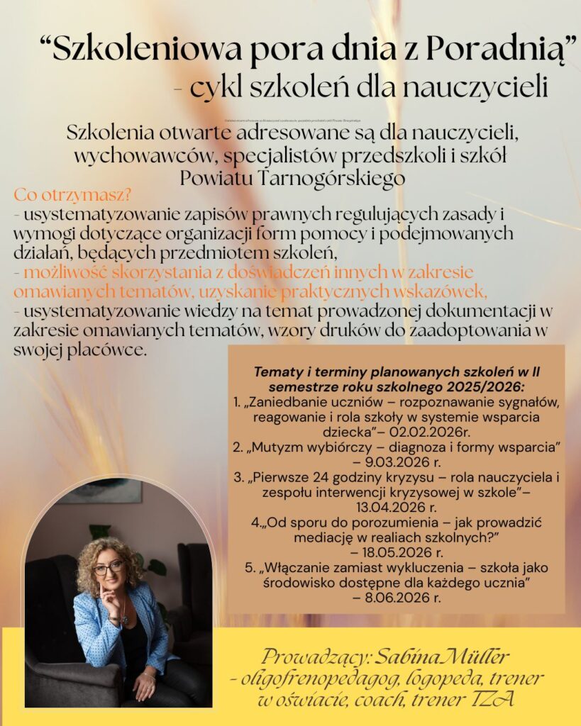 Miejsce: Powiatowa Poradnia Psychologiczno-Pedagogiczna w Tarnowskich Górach, ul. Sienkiewicza 16, sala konferencyjna (I piętro)